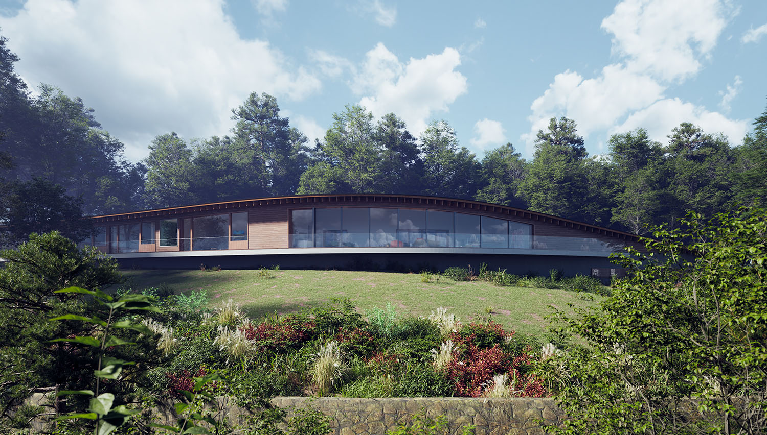 南に傾斜するさえぎる物のない眺望、円弧状の平坦な土地。それらを活かすべく、大自然に開いた大らかな建築を考えました。曲面の壁と屋根が作る柔らかな表情は、都会で失った静穏を蘇らせます。屋根は地形とは逆向きの勾配とし、大自然を取り込む大きな開口部を生み出しました。良質な建築はその土地とともにあると考え、地域にある素材を建材として使用しました。石材は長野県の芦野石、壁の木材は長野県の杉を用いています。