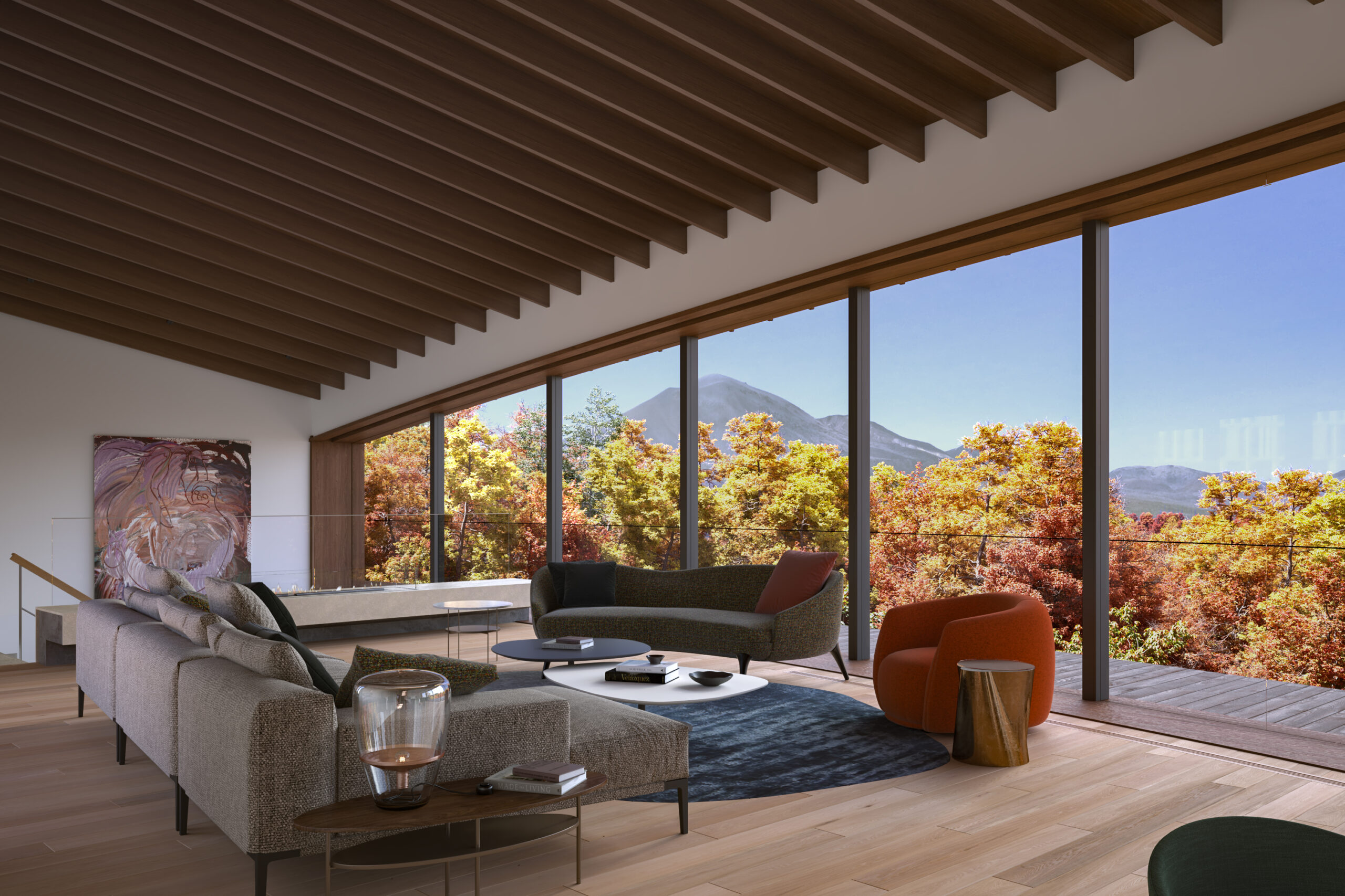 階段を上がり視界が開けると、北側に向いた約16m の窓から浅間山を望む森のパノラマが目に飛び込みます。