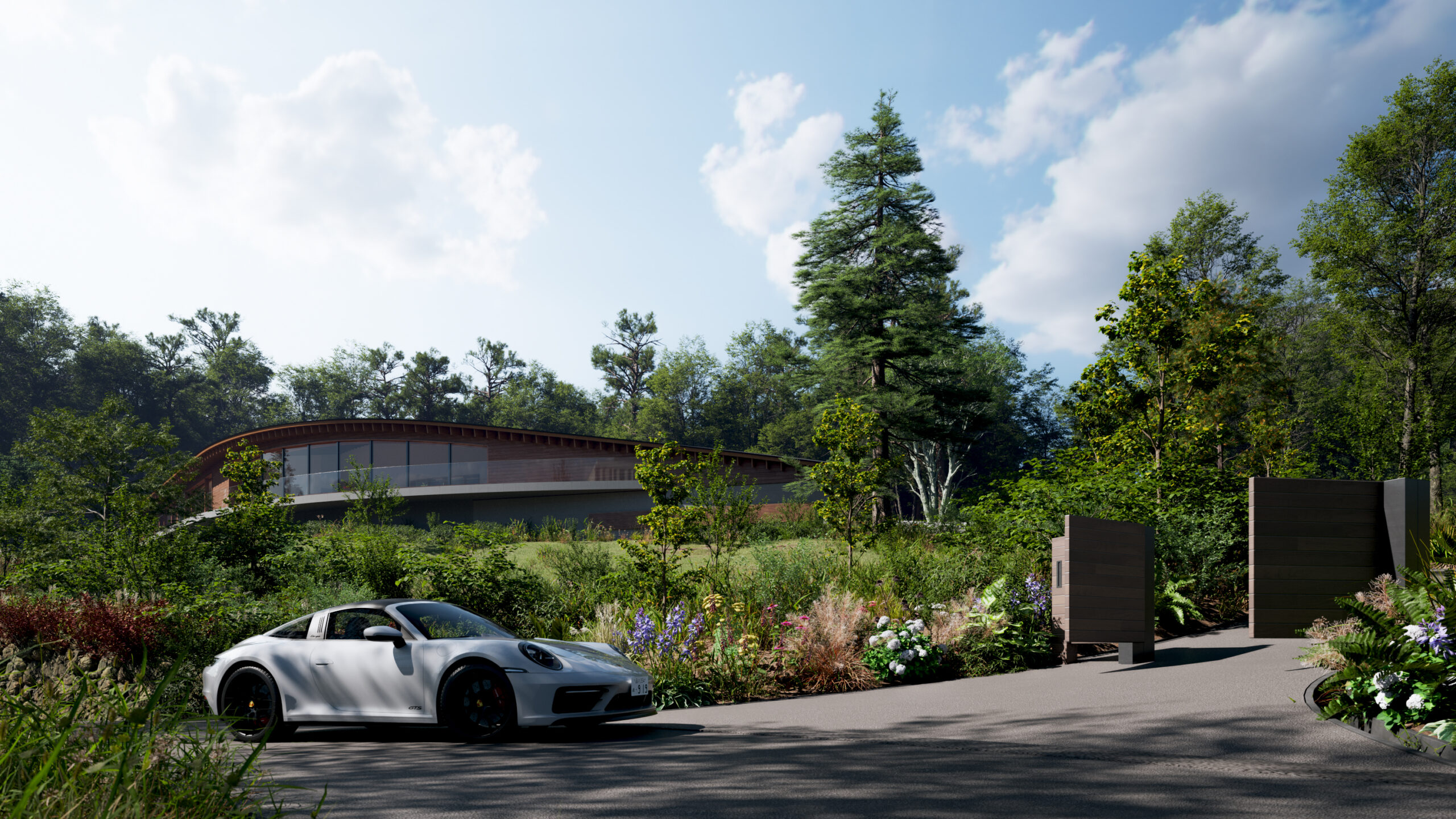 軽井沢の深い緑に溶け込むように建つ、柔らかな曲線を描く邸宅。